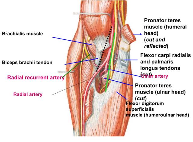 – 桡、尺动脉:于桡骨头或稍下水平分出