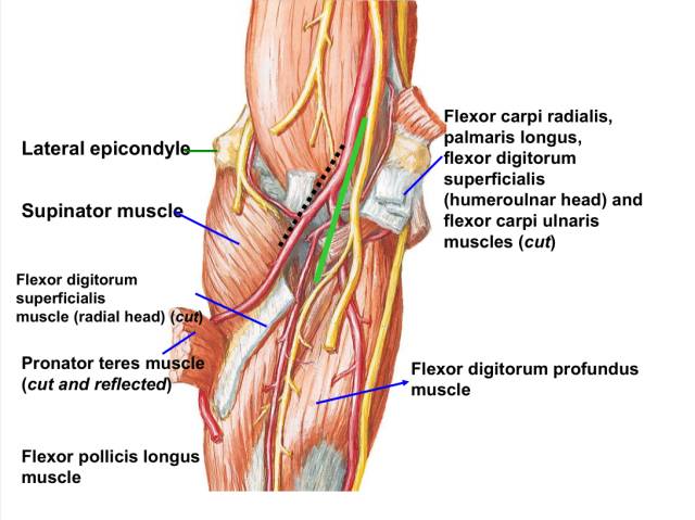 - 走行:与肱动脉伴行--肘部位动脉内侧—穿旋前圆肌两头