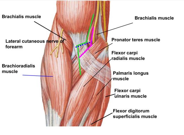 - 特点:其肌支肘部位尺侧,掌部位桡侧