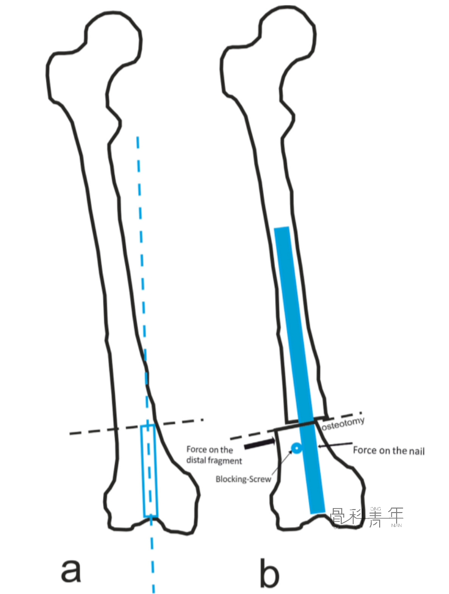为了矫正股骨力线,在干骺端横行截骨(a横行虚线)后,截骨远端移位,此时髓内钉置入后应为偏心方可维持矫形,为了获得髓内钉位置,需要置入阻挡钉(b)。