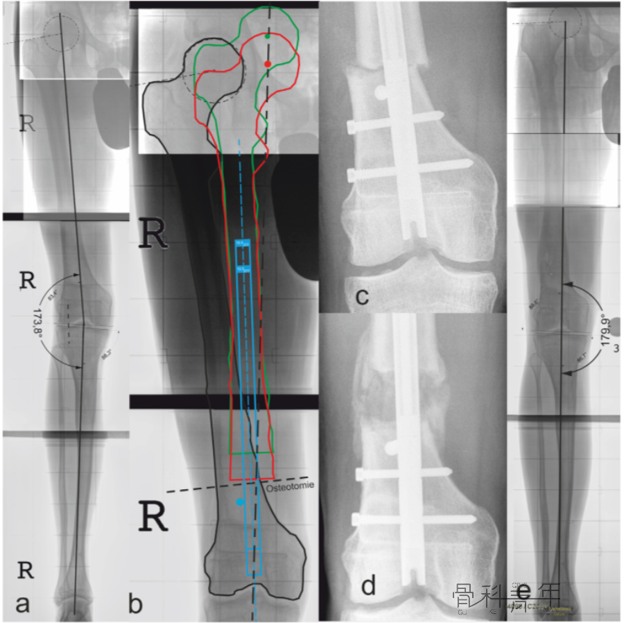 图a所示该患肢与健侧相比,存在6.2°外翻和28mm短缩。图b红色轮廓为纠正力线后截骨近端的形态,绿色为同时纠正外翻和短缩后股骨近端的位置,依照绿色轮廓置入髓内钉,此时髓内钉进入截骨远端为偏心,为了维持髓内钉位置,阻挡钉置入位置明确。图d可见髓内钉及阻挡钉置入后情况。