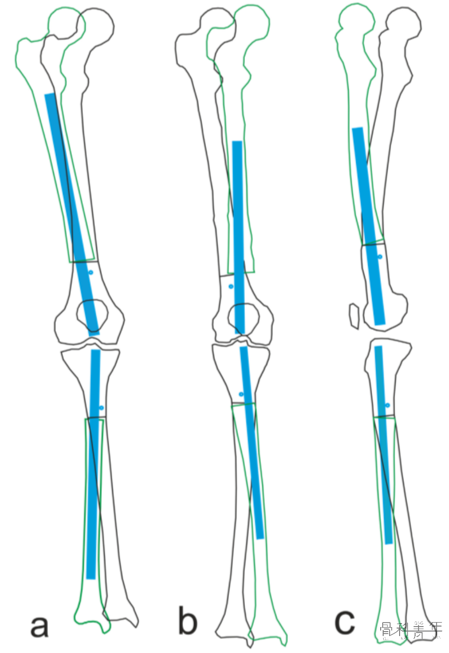 1.沿移位骨块(远干骺端为远端骨块、近干骺端为近端骨块)作一中轴线;