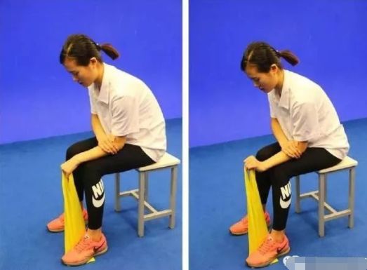 【初级动作】坐在凳子上,一脚踩住弹力带的两端,健手固定患手前臂于大腿上。患手抓住弹力带,腕关节在无痛范围内,做屈伸运动。屈伸肌训练交替进行。