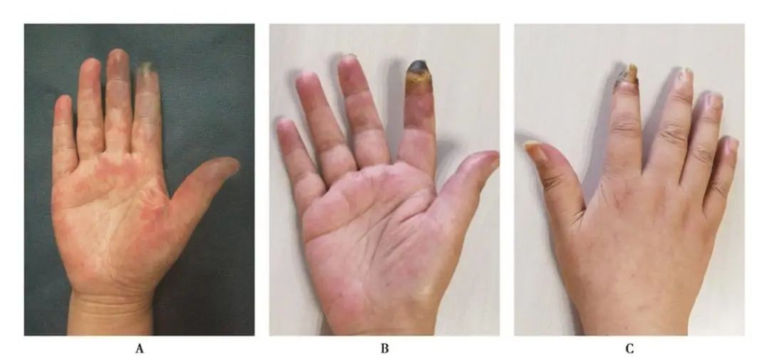 图3 局部封闭致示指指尖坏死A.手部皮肤呈花斑状;B、C.示指中节以远血供差,指尖坏死