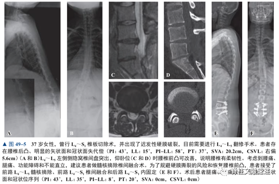 总之,评估站立位全脊柱X线片、CT平扫或增强、增强MRI扫描,明确之前手术的减压情况、邻近节段疾病、假关节形成、局部或全脊柱畸形,以便制订最优的手术计划。翻修减压是从“正常”结构进入。