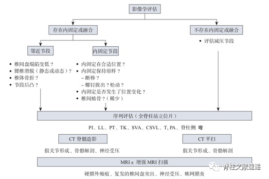 之前使用内固定的患者和未使用内固定的患者相似但不完全相同。除了对之前的减压和节段性病变情况进行影像学评估外,使用内固定的患者需要进一步检查螺钉松动/断裂情况、固定的头端和尾端相邻节段,以及固定区域植骨融合的情况。通过X线可以初步判断融合情况,CT可以清晰观察到原植骨区域是否骨性融合。