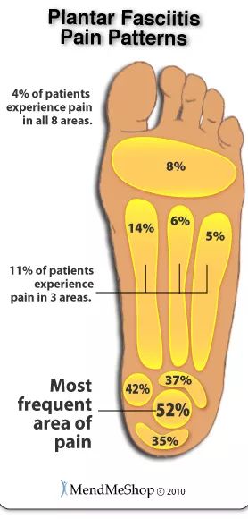 多为单侧。最常见的部位是脚后跟中心地带。左侧的图给出了常见痛点的分布。