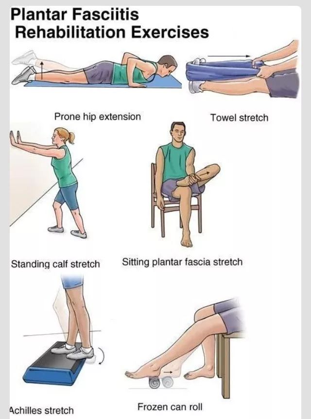 大多数有足底筋膜炎的人在几个月的保守治疗后可以恢复。这些治疗包括休息、冷敷痛点、伸展运动来舒展足底筋膜和跟腱、力量训练等理疗来加强小腿肌肉的力量,稳定你的脚踝和脚后跟。理疗师也可能教你使用运动贴布来支撑你的脚底。可以试试下面这些动作。很管用哦!