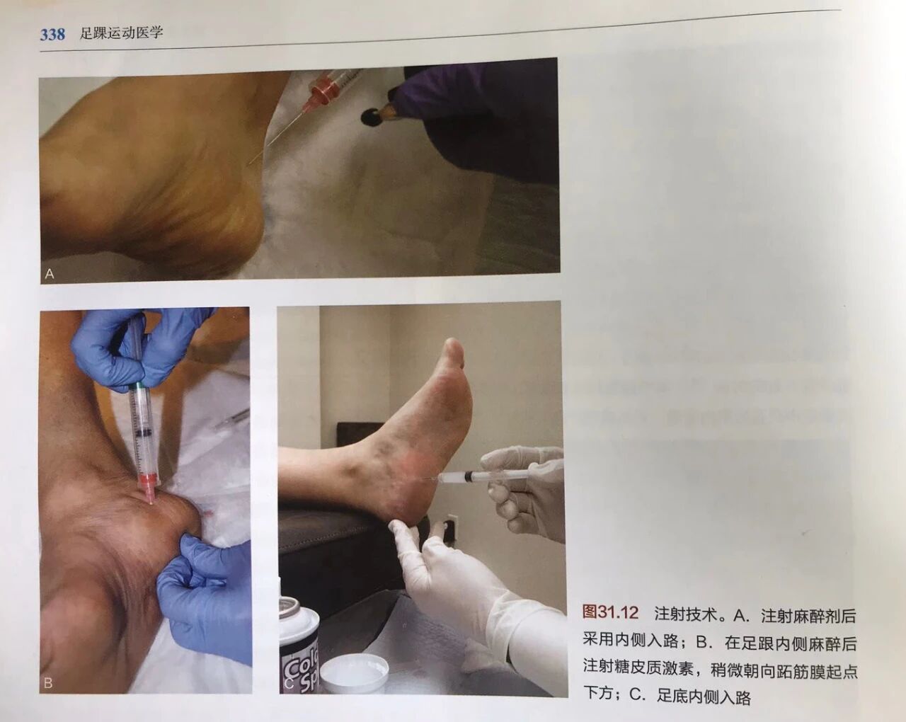 一般使用 1-1.5ml 的中效激素(如倍他米松 6mg/ml 或者地塞米松 4mg/ml 和醋酸甲泼尼龙 40mg/ml 的混合剂)从内侧或者足底内侧面注射到筋膜的起点上下方。