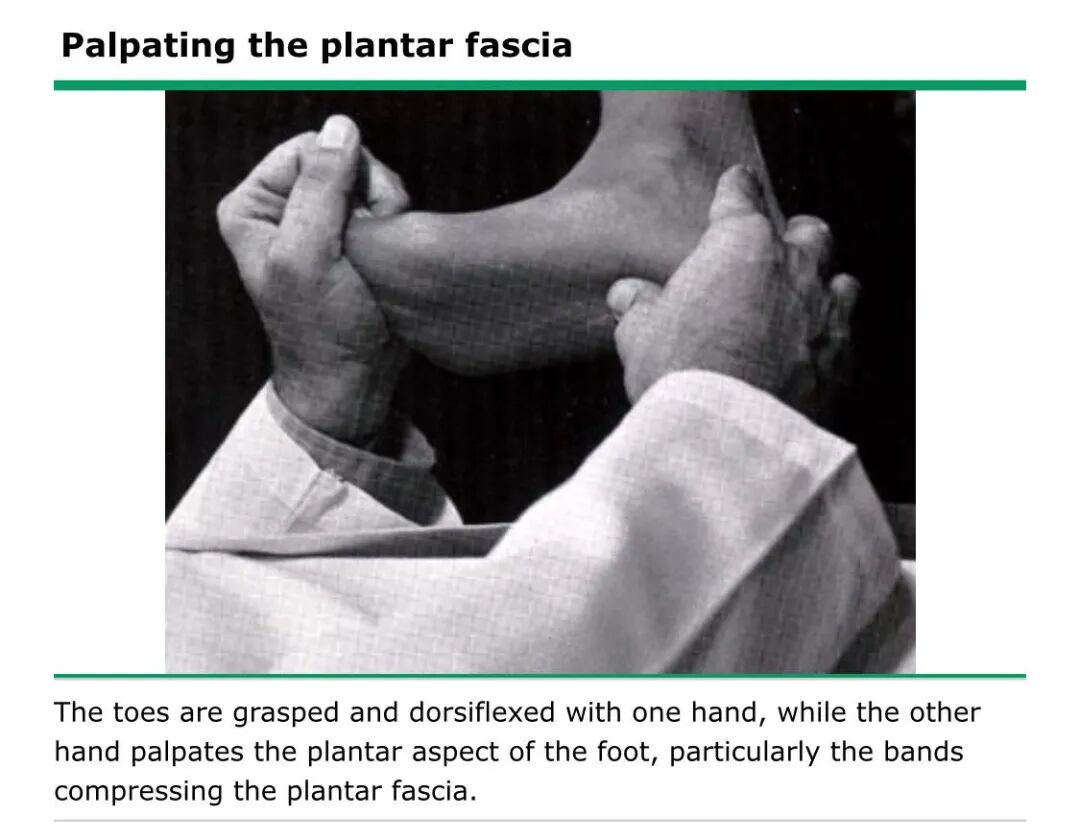 以下方式可以最好地引出压痛:检查者用一只手使患者足趾背屈从而绷紧足底筋膜,然后用另一只手的拇指或食指沿筋膜从足跟向足前段触诊。