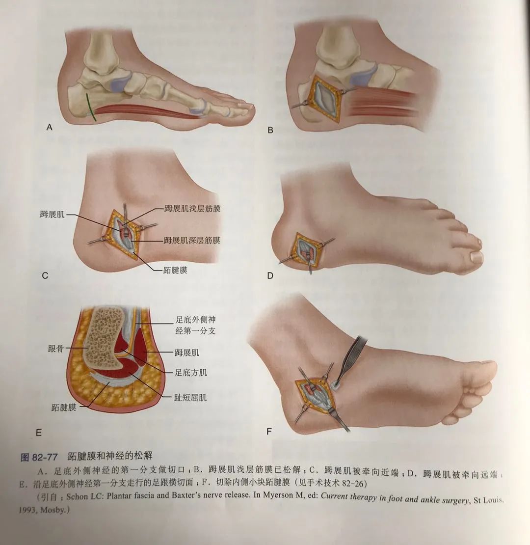筋膜手术有三种基本方法(开放、经皮和内窥镜),普遍认为部分跖筋膜切断是治疗的关键,如有骨刺也不需要处理。