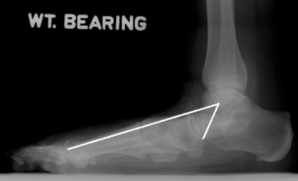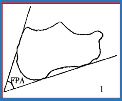 跟骨倾斜角calcaneal pitch angle/heel pitch angle,HPA/calcaneal inclination:负重侧位片中跟骨下表面最低两点连线与水平线的夹角