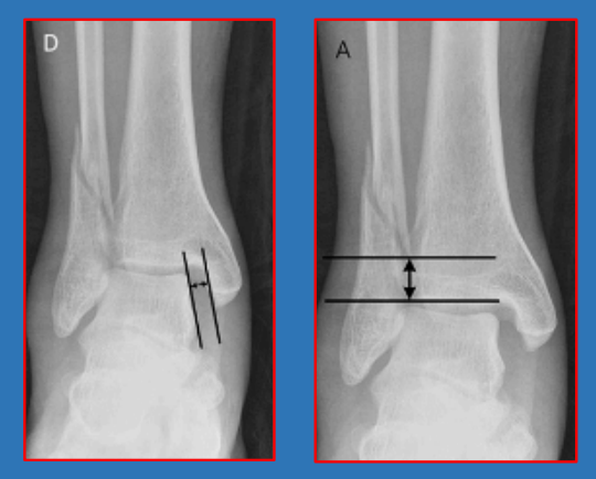 胫腓间隙、重叠,胫腓间隙在前后位上大于6mm或胫腓重叠在前后位上小于6mm、在踝穴位上小于1mm,即表示存在下胫腓联合的分离。