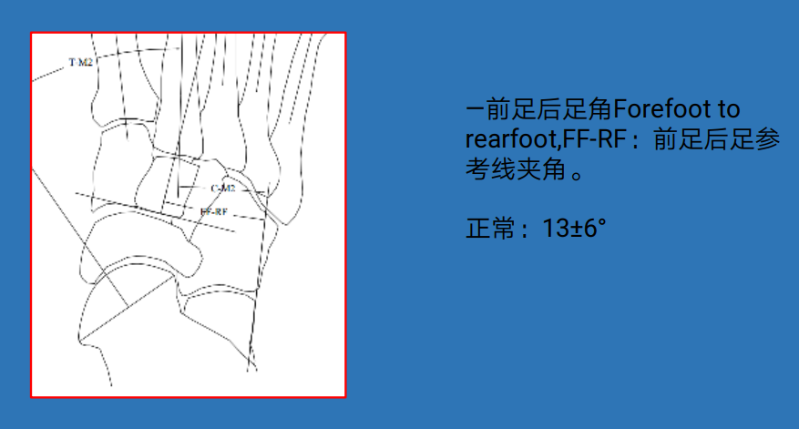 正常范围:10~30°。对足弓判断较为敏感,特异性也较高<10°平足,>30°弓形足