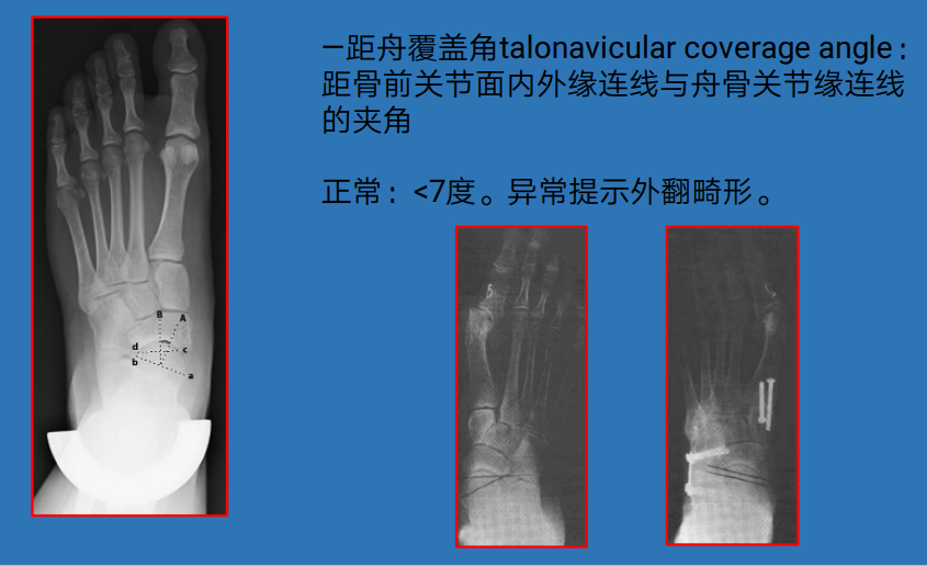 正位距跟角AP talo-calcaneal angle:负重正位跟骨长轴与距骨长轴间夹角。距骨长轴:通过距骨头和颈中心的连线(前关节面内外缘连线中点的垂线);跟骨长轴:通过跟骨前关节中点和后结节中点的连线(前结节外侧壁延长线)