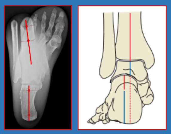 正常后足力线:跟骨与胫骨干长轴平行,两轴线间垂直距离5-10mm,两轴夹角为跟骨内外翻角。