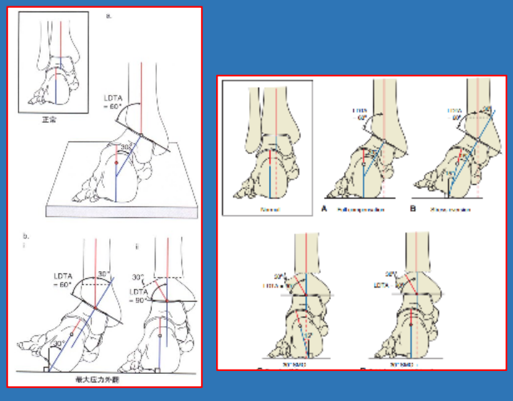 胫骨远端外倾角Lateral distal tibialangle,LDTA:正位片上,胫骨远端关节面平行线与胫骨干轴线的夹角:正常86~92°,平均89°