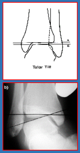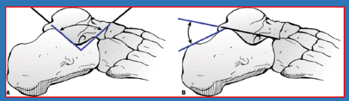 距骨倾斜角Talar Tilt:应力内翻时胫骨远端,关节面平行线与距骨近端关节面平行线夹角。