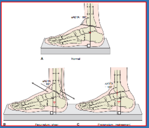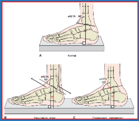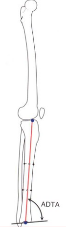 胫骨远端前倾角Anterior distal tibialangle,ADTA:侧位片上,胫骨远端关节面平行线与胫骨干轴线的夹角正常80±2°
