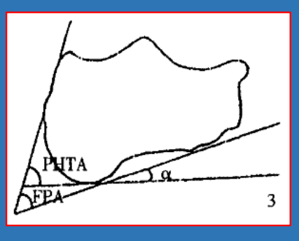 后跟全角(posterior heel total angle,PHTA):跟骨外后上斜面与水平线的夹角:正常值范围为64~89°,≥89°为异常,考虑了α角(pitch angle),即足弓异常。