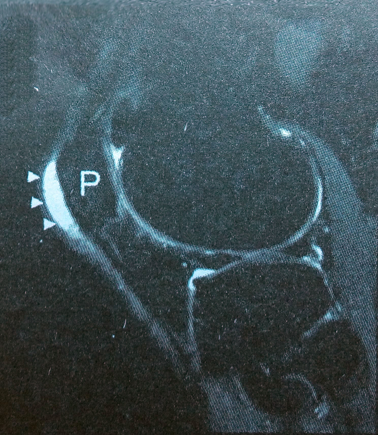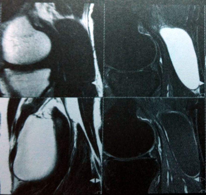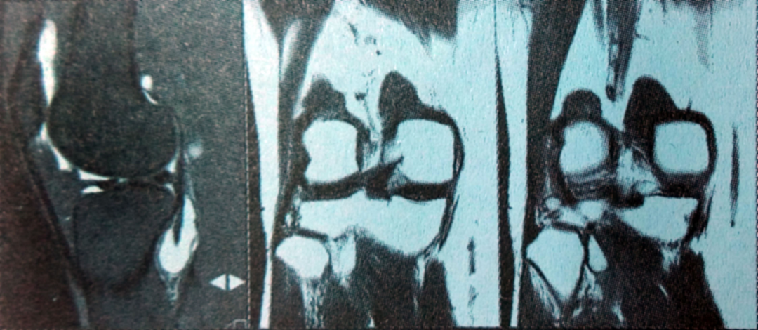 MRI表现:股骨远端前侧局部液体聚集,完整的髌上皱襞分开髌上滑囊与膝关节。