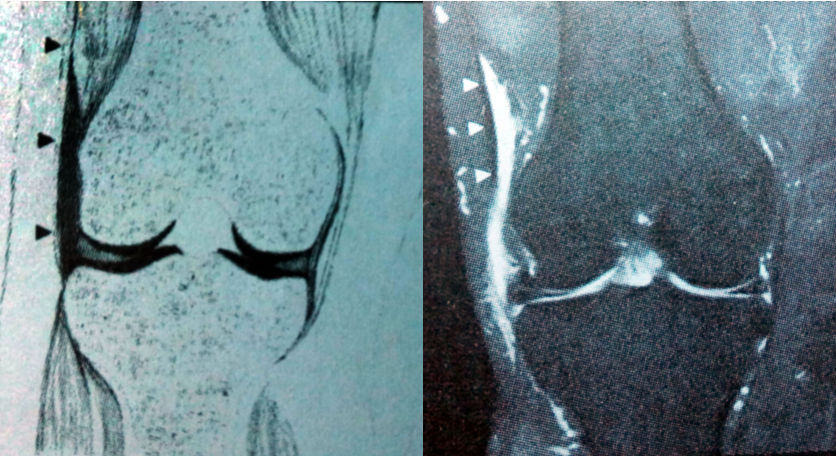 MRI表现:内侧副韧带的表层与深层之间的边界清楚的液体聚积信号。此必须和内侧半月板囊肿或半月板囊分离鉴别。因此在T1或T2*WI冠状位上排除内侧半月板撕裂和详细检查半月板的边缘显得十分重要。