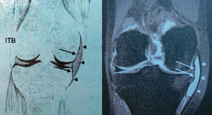 MRI表现:边界清楚的液体聚积影,位于髂胫束韧带远端止点附近到胫骨前外侧面。髂胫束腱鞘炎有相近的临床表现,但是MRI显示在T1WI和T2WI上边界欠清的信号增高,以此可与滑膜炎鉴别。