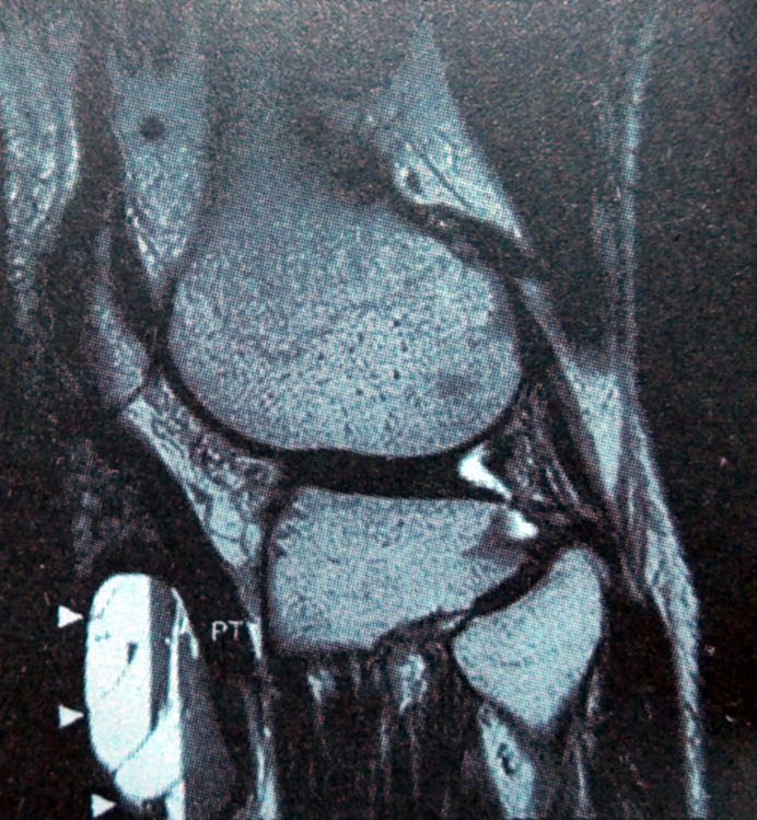 腱鞘囊肿排列扁平梭形细胞的囊性结构,包含粘蛋白和水。可发生在关节囊,韧带,腱鞘,滑膜囊或软骨下骨内。在膝关节,大多数腱鞘囊肿出现在交叉韧带附近,近期的关节镜检查系列报道前交叉韧带末端胫骨是最常见的发生部位。腱鞘囊肿通常不与关节直接相通。关节内的腱鞘囊肿可引起膝关节屈曲受限,关节交锁,疼痛,扩展至关节外时可触及的肿物。