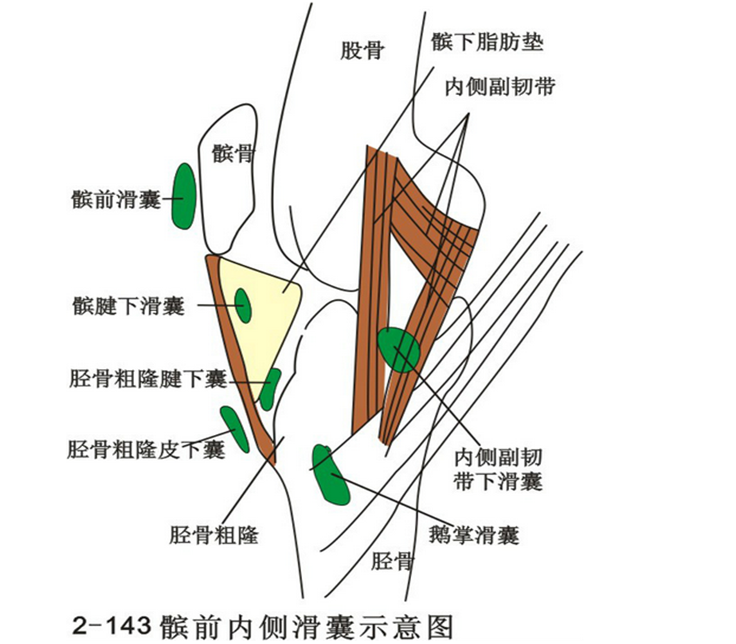 位于髌韧带与胫骨上端之间,独立的关节囊,正常关节液体很少,与关节腔不通。