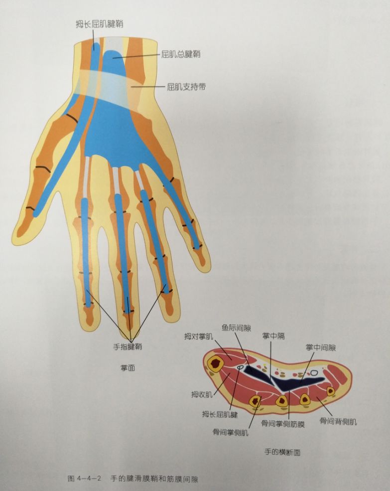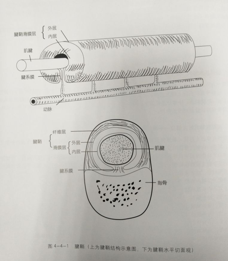 腱鞘分为两层,外层为纤维性鞘膜, 内层为滑液膜。滑液膜可分为壁层和脏层,壁层附着于纤维性鞘的内面,反折覆盖在肌腱上即为脏层,又称为腱外膜。脏壁层两瓣形成盲囊,腱鞘内有一层薄 膜称为健间膜或腱系膜,把腱鞘内、外部分连接起来。位于内外壁之间的腱鞘腔含有少量滑液,类似关节腔内的物质,起着润滑和保持肌腱活动度的作用。