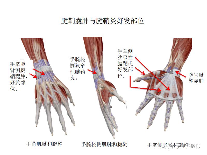 图3,常见手部腱鞘囊肿和、狭窄性腱鞘炎和屈指肌腱炎发病部位。