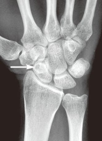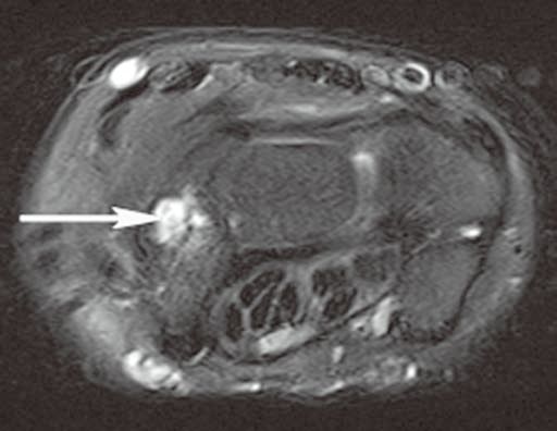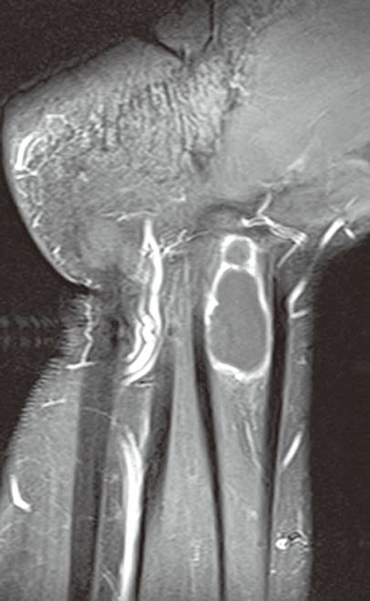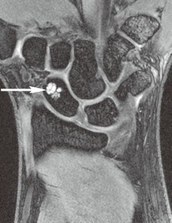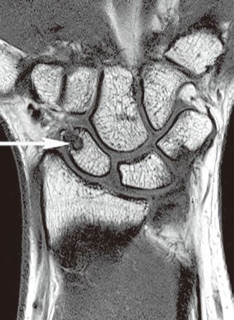 左腕正位X线平片(A)示手舟骨远部骨内一小的透亮区。冠状位T1WI(B)示骨内病变呈低信号(箭)。冠状位(C)和横轴位(D)脂肪抑制T2WI示病变呈高信号,提示为液体(箭)