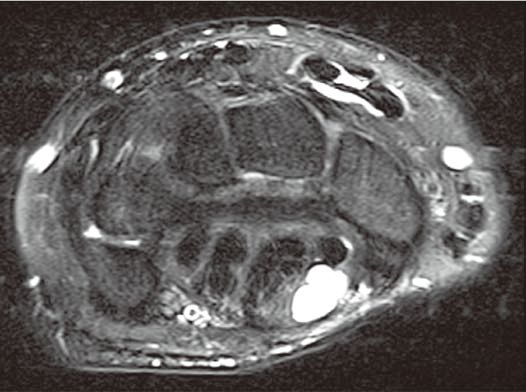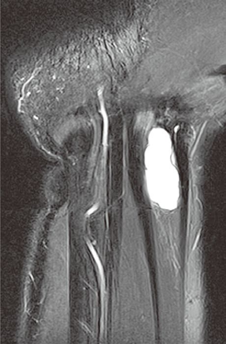 横轴位(A)和冠状位(B)脂肪抑制T2WI示腕管内较大的腱鞘囊肿,内含液体而呈高信号。冠状位脂肪抑制增强T1WI(C)示囊壁强化而囊液不强化