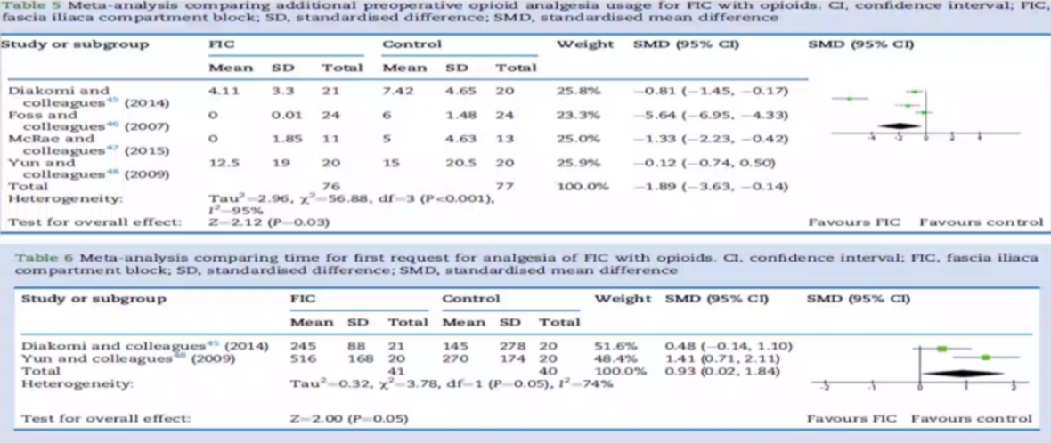 有研究比较髂筋膜阻滞与其他镇痛方法发现,术前髂筋膜阻滞优于对照方案,降低患者疼痛评分,减少阿片药物用量,缩短腰麻操作时间,是非常有效的补充性镇痛手段。腰麻操作摆放体位前进行单次髂筋膜阻滞与静脉注射芬太尼相比,能降低患者疼痛评分,降低术后吗啡用量,延长术后首次追加阿片药物时间。