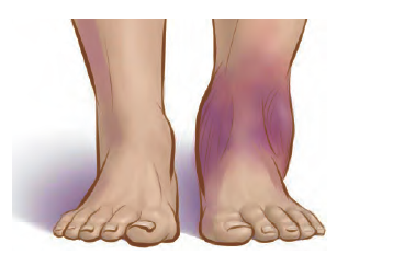 II度表现为:中到重度疼痛,伴有肿胀、僵硬和行走困难,部分可见足部瘀斑,外侧副韧带中度不完全撕裂,可伴有部分关节不稳;