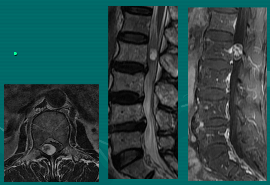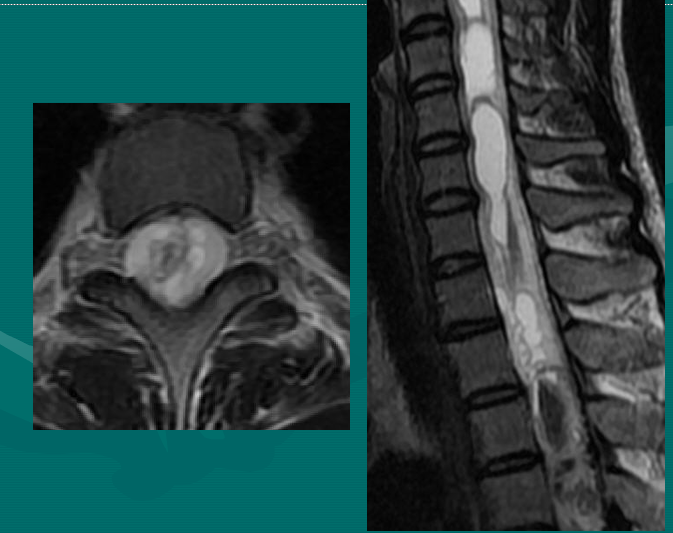 三、 神经源性肿瘤 为慢性进行性疾患,无间歇好转或自愈现象,常有大小便失禁。脑脊液蛋白增高,MRI可敏感的发现肿块及其与脊髓或椎体的关系。