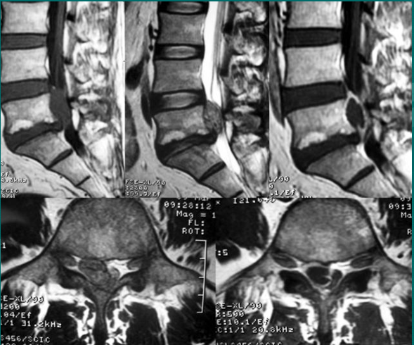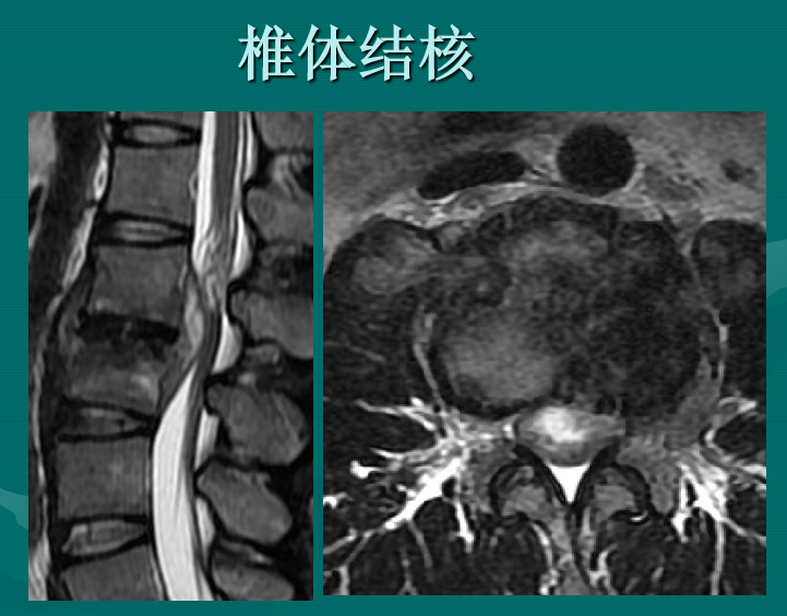 二、腰椎结核 早期局限性腰椎结核可刺激邻近的神经根,造成腰痛及下肢放射痛。腰椎结核有结核病的全身反应,腰痛较剧,MRI上可见椎体或椎弓根的破坏,并可见椎旁脓肿。对X线片不能显示的椎体早期局限性结核病灶有独特作用。