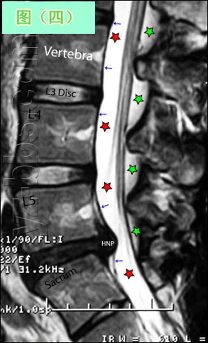 后纵韧带(PLL小蓝箭头)在图像中表现为沿着每个椎体及椎间盘后缘垂直向下的黑线。有意思的是,尽管此病人有一个9mm的椎间盘突出(HNP),骨质有一定的翘起,在椎间盘平面以上可见髓核物,但后纵韧带仍然包容着突出的髓核物而没有游离出。这种情况在学术上被称作一个大的包容性椎间盘突出。