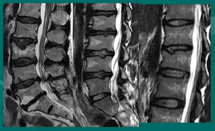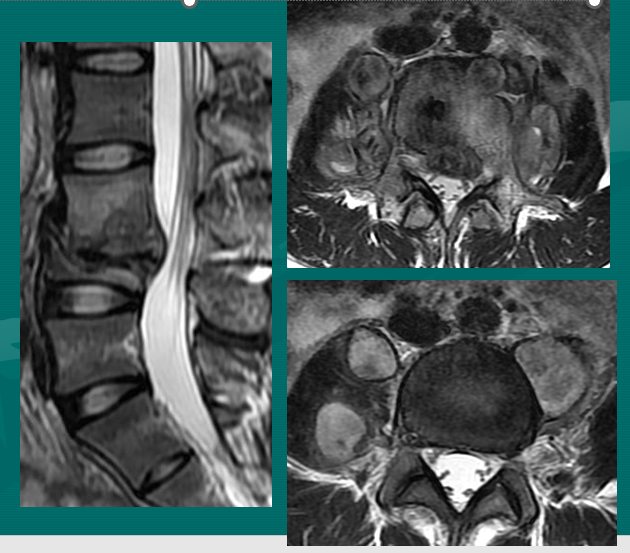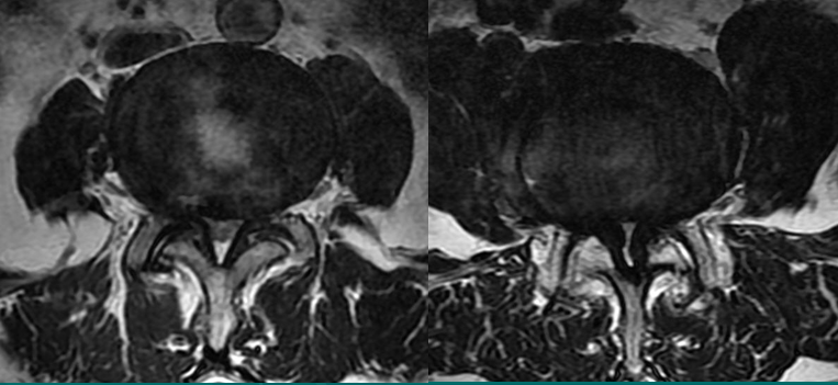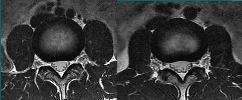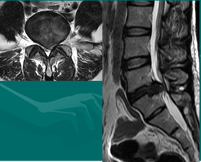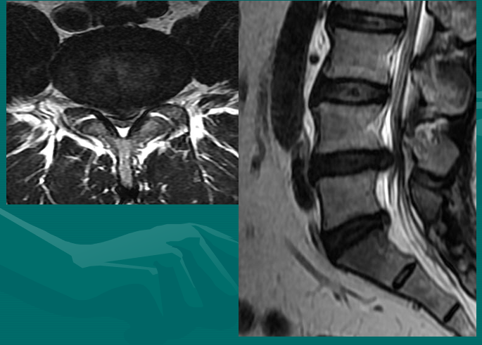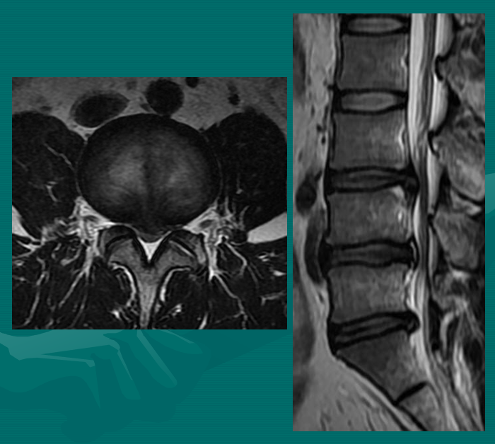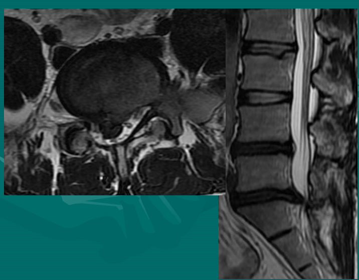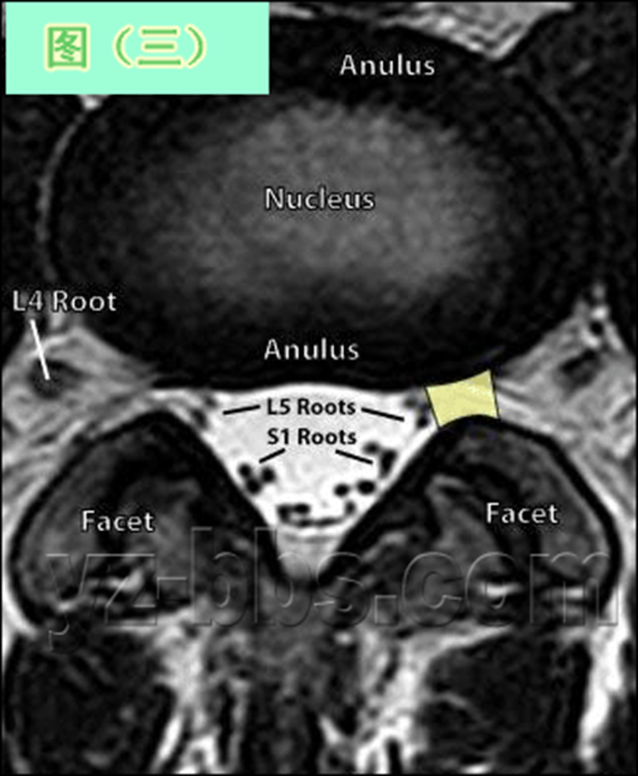 在此图中,可清楚地看到悬挂在硬膜囊内的细小的神经根(L5神经根及S1神经根),它们以不完全有绪地状态排列着。注意,神经孔是很开阔的(浅黄色区),表明没有因邻近椎间关节问题形成在的椎管狭窄。T2加权象对于察看退化性椎间盘病是最好的,因为T2像将富含水份的结构表现为亮白色, 含水少的区域表现为黑色。