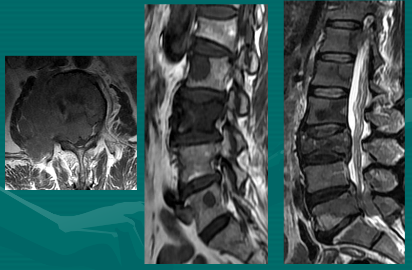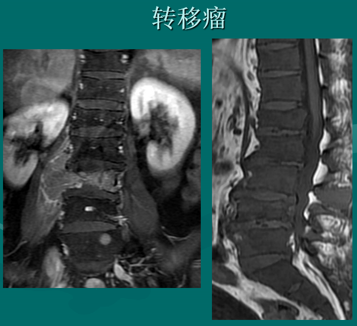 一、椎体转移瘤疼痛加剧,夜间加重,患者体质衰弱,可查到原发肿瘤。MRI可见多个椎体溶骨性破坏,但椎间盘完整。