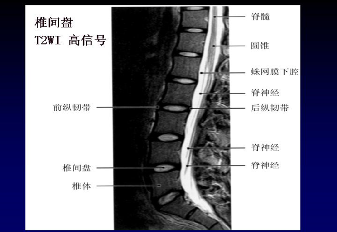 硬膜囊(红星)表现为“超白色”结构,填充在椎体后方的中央椎管内。此囊袋内有可自由浮动的由运动神经纤椎及感觉神经纤维共同组成的脊神经根(马尾)。