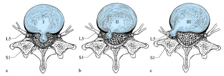 外侧型椎间盘疝出物位于椎管内一侧,未超过椎间孔内口,主要对硬膜外脂肪间隙、硬膜囊和神经根形成压迫;