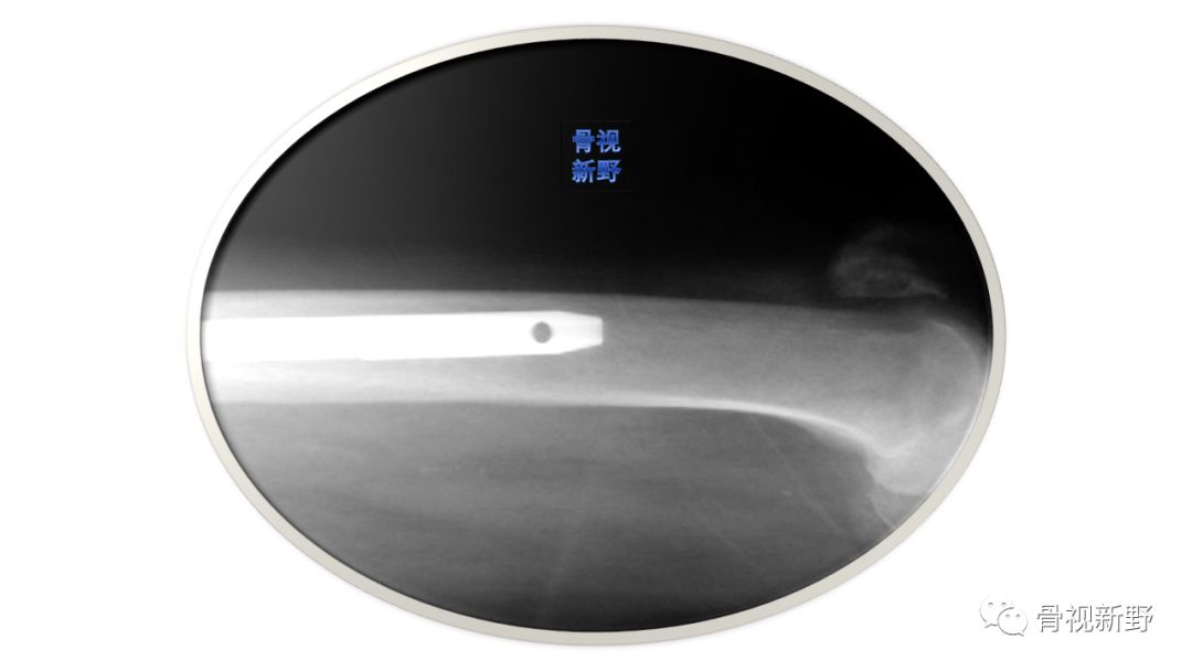 需要提醒的是,主钉一般可通过徒手插入(通过快速来回旋转连接主钉的近端瞄准臂推进),尽量避免使用锤子进行敲击打入,以免造成医源性骨折。如果主钉不能徒手插入,需要锤子敲击的话,说明这本身是有问题的,需要分析原因,是否需要进一步扩髓(加大、加深),以免主钉卡在股骨干远端髓腔;或因髓钉前弓与股骨前弓不匹配发生了主钉末端在股骨远端前皮质的撞击。分析具体原因,针对性地解决,但坚决不能用锤子勉强打入。