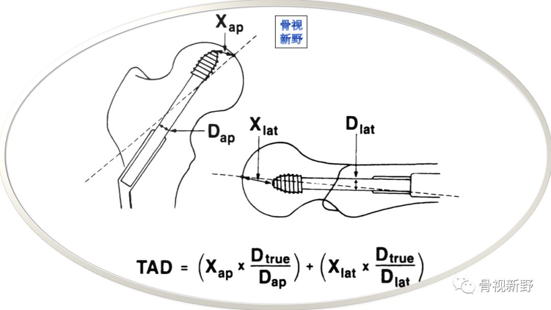 无论用髓内钉或钉板系统,TAD是评估头钉深度和居中程度的重要指标;也是预测反转子骨折固定成功最重要的指标。过去,旧的理论主张偏下、偏后置钉,这样会使前、上股骨头内保留较多骨量,但会增加TAD,现代理论建议避免。