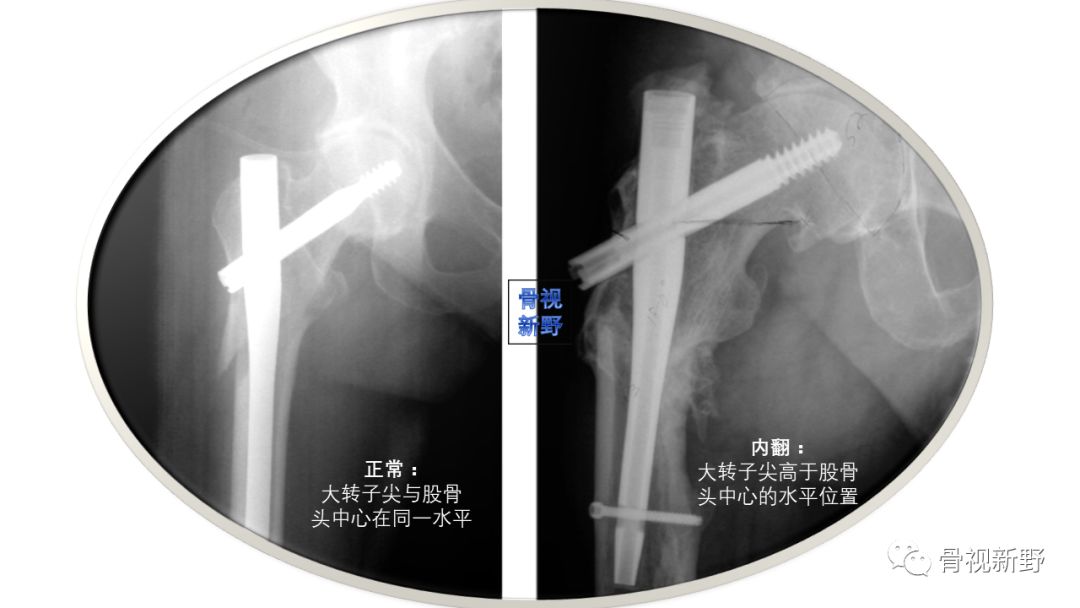 内翻成角可导致力臂增加而致负重后固定失败的风险增加;内翻成角也可致头钉偏上固定而增加切出的风险。粗隆间骨折的颈干角有时很难判断,但一般髓内钉的颈干角是130°,这点需要了解。而判断骨折有无内、外翻,可通过大转子尖与股骨头中心的相对位置来估计,正常颈干角,二者在同一水平面。如果股骨头中心低于大转子尖,则说明骨折内翻,反之为外翻。