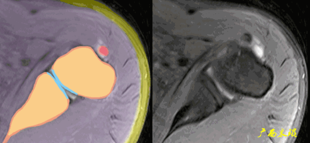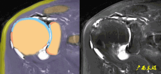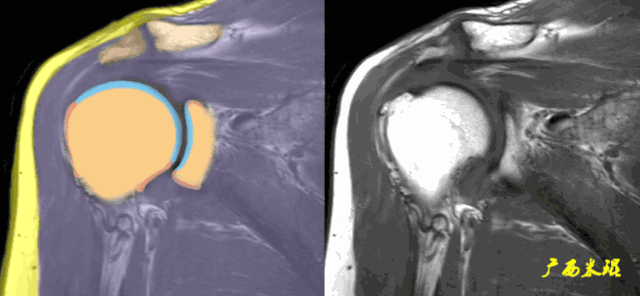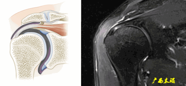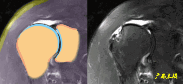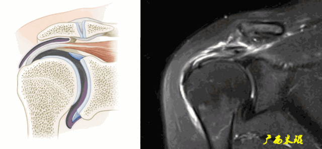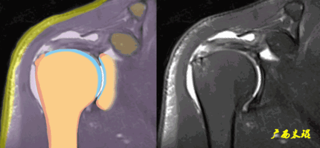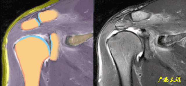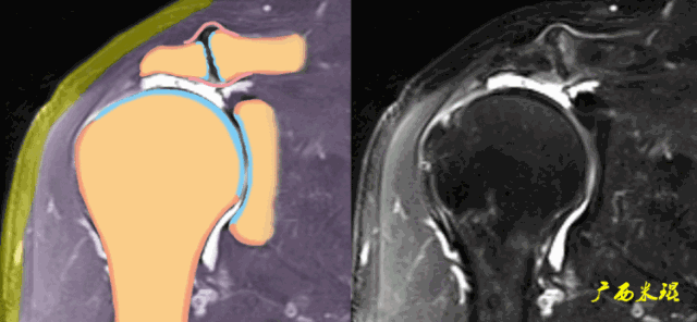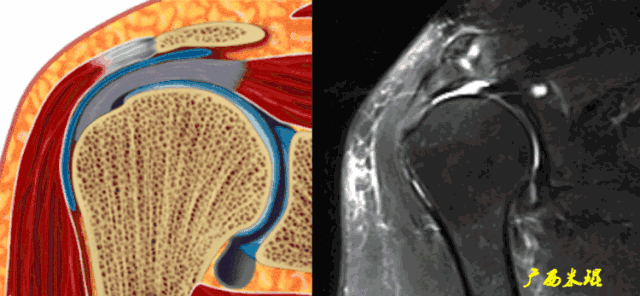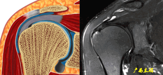 肩峰下滑囊是一个非常重要的解剖结构,大部分肩关节的病变都会波及,肩袖损伤更不例外,同时,肩峰下滑囊炎的病变也可以波及到肩袖等组织。肩峰下滑囊炎在MRI上表现是非常明显的,如果其正常,肩袖一般也正常。