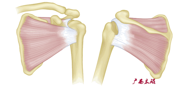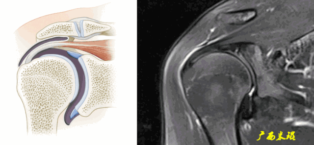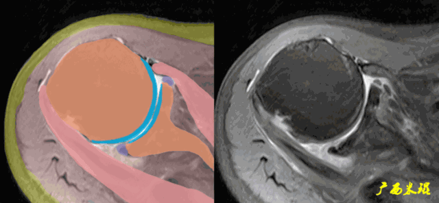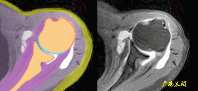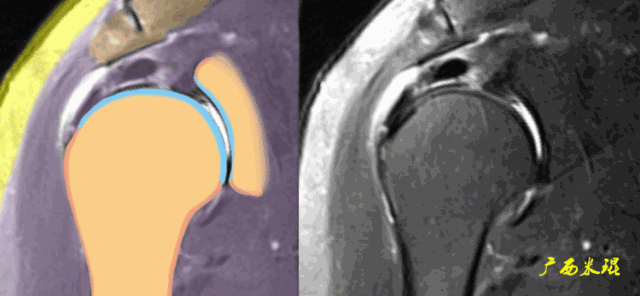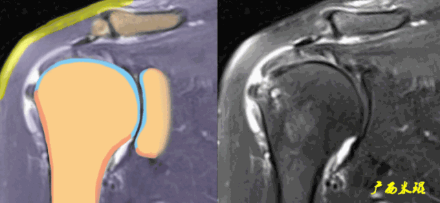 盂肱关节关系异常在轴位片上也可能看到,一般是由于肩胛下肌或冈下肌和小圆肌的撕裂后力量不平衡所造成。