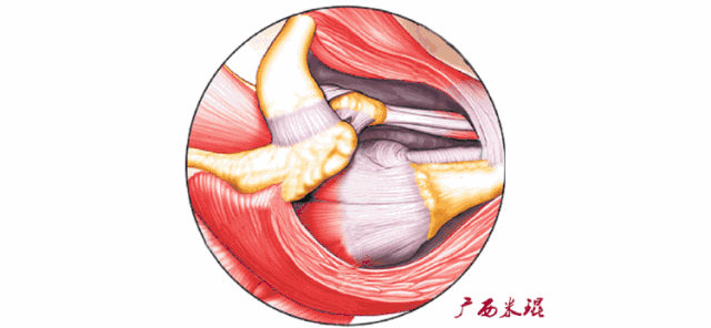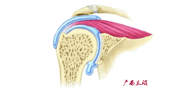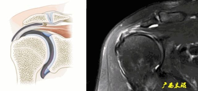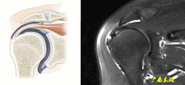 b.肩峰下滑囊贯通(与关节腔相通),预示着肩袖的完全撕裂。