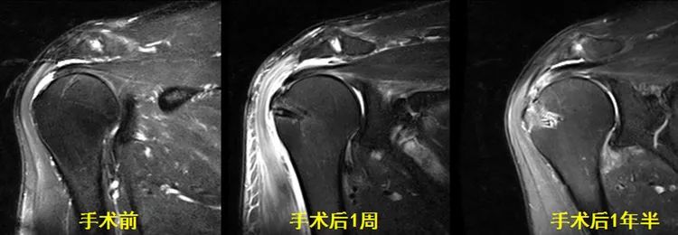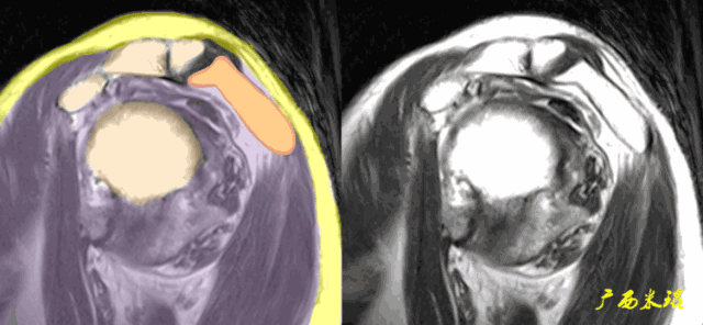 冈上肌和冈下肌在肱骨大结节上有共同止点,冈上肌和肩胛下肌在结节间沟处共同包绕肱二头肌长头腱。这样紧密的关系预示着肩袖的某一部分组织发生病变一般都会波及其余的肩袖组织,也是我们MRI阅片中必须要注意的。