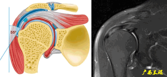 肩峰骨刺在斜冠状位上能够看到,应该认真观察并且留意其对应的肩袖面。